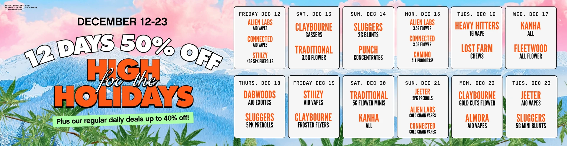 Weekly Schedule: Monday Edibles, Tuesday Vapes, Wednesday 3.5g Flower, Thursday Dabs, Friday Infused Prerolls, Saturday All Products, Sunday Vapes. Special offer: Every Friday $60 Getaway Bag Drop while supplies last.